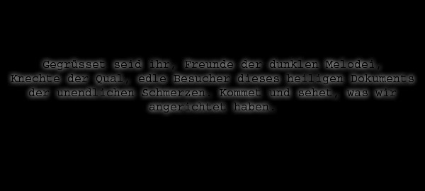 | 03.10.06 | Nach langer Zeit gibt's mal wieder was neues von uns: Wir spielen am 11. November in Gemünden-Wernfeld auf dem "Black Winter Day" zusammen mit Lost Life, Fragmentory, Death Court & Atopie. Vielen Dank für die Einladung an Soundflash Events! Des weiteren werden wir demnächst auf dem Franconian Death Sampler mit einem unserer Lieder vertreten sein. Näheres dazu bald!